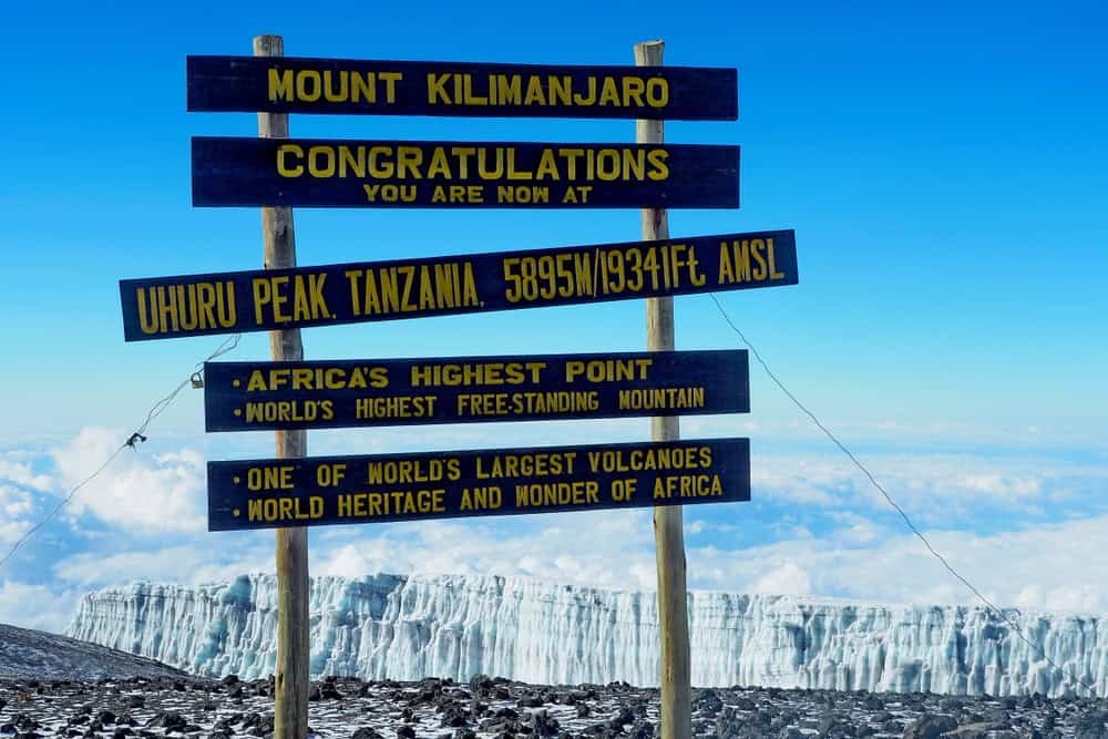 - Arctic Zone – The snow-covered summit with glaciers and the iconic Uhuru Peak sign.